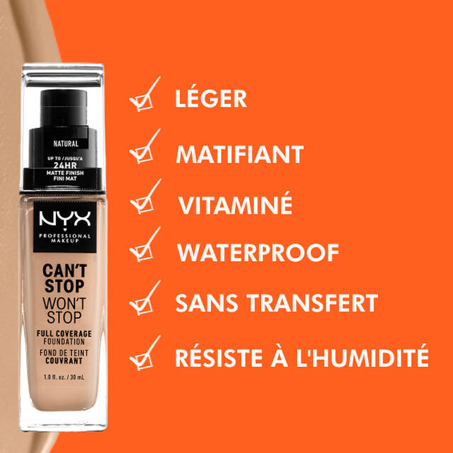 Bien que couvrant, notre fond de teint liquide Can’t Stop Won’t Stop est léger et agréable à porter. Sa formule waterproof garantie sans transfert est disponible en 45 teintes. Crémeux, il se fond avec ta peau et aide à contrôler la brillance pour t'offrir un teint matifié tout au long de la journée. Mais c'est n'est pas tout. Il est non comédogène et convient aux peaux normales, grasses, mixtes et sensibles.